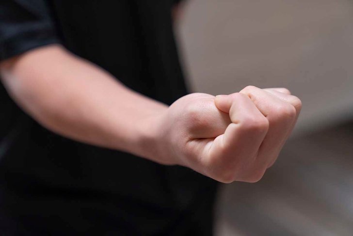- Fold your fingers down until to form a straight-fingered fist with your thumb tuck in against your index finger.